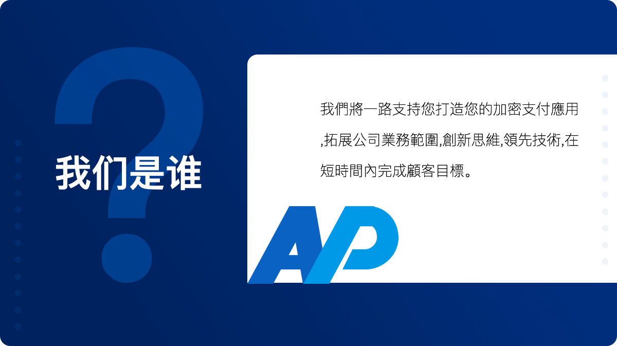 不段滿足客戶期望以及需求,為客戶建立全球最棒的第三方支付系統!不段精進技術,提供最棒的虛擬貨幣第三方支付系統,成為全球最頂尖的平台公司!讓您輕鬆接收USDT等虛擬貨幣!